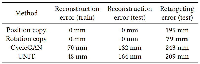 The results argue so far against our initial hypothesis that deep learning methods can successfully perform unpaired motion retargeting, as a simple method copying joint orientations (rotation copy in the table) can better retarget motions. More experiments will be conducted in order to properly identify the causes of this failure.