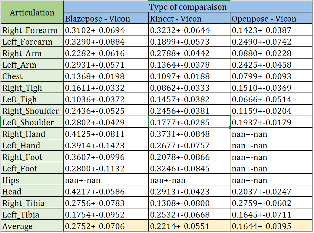Table 1: The comparison of error between Blazepose-Vicon, Openpose-Vicon and Kinect-Vicon