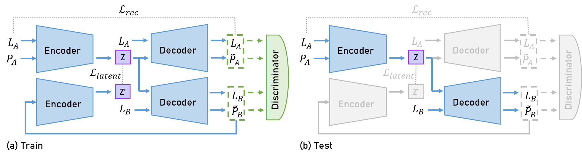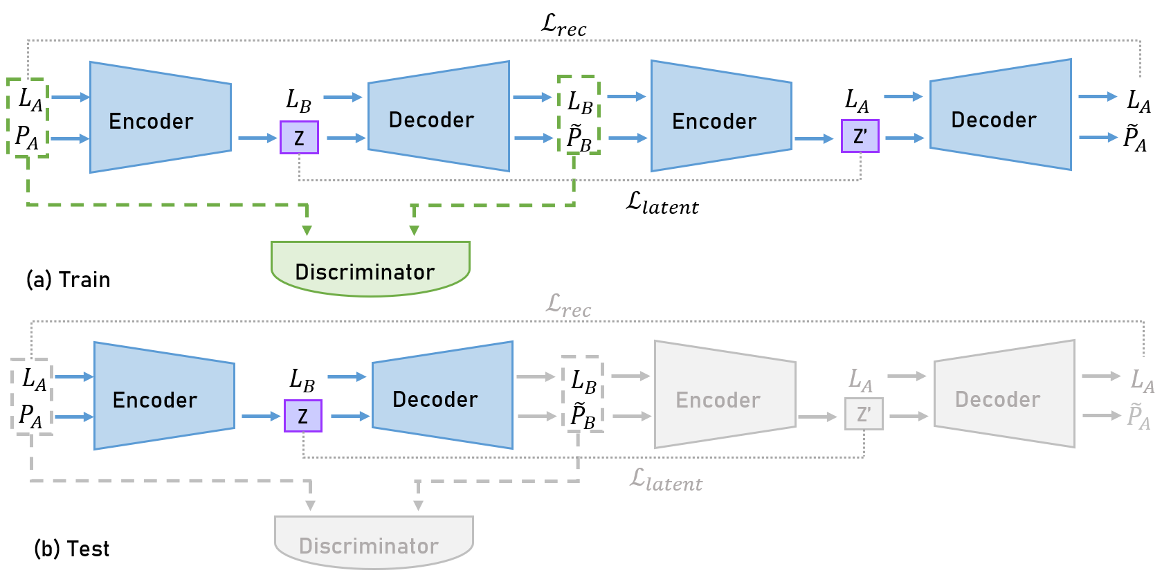 The encoder takes as input $x^A$, a sequence of joint positions in the domain of motions performed by a performer $A$. It infers a latent variable $𝑧$ from this input motion, disentangling information about the motion itself from the information about the performer, as represented in the Figure 5. Then the decoder takes as input this latent variable $𝑧$ as well as the lengths of the performer $B$ bones, that we denote $l^B$, and outputs a prediction $x^B$ corresponding to the motion translated to the domain of motions performed by the performer B.